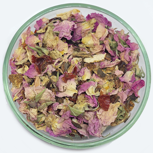 Sastav: korijen ehinaceje (Echinacea purpurea), plod šipka bez koštica eko (Rosa canina), pupoljci bugarske ruže eko (Rosa damascena), korica limuna eko (Citrus x limon), kora divlje trešnje (Prunus serotina)